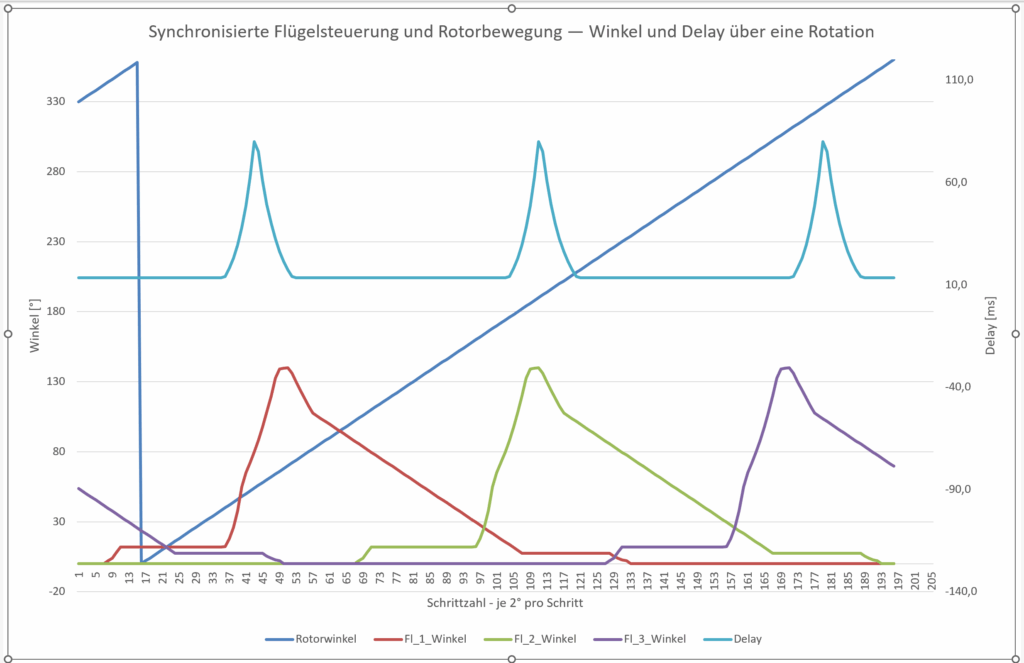 Gezeigt wird eine vollständige Rotation (360°), visualisiert aus einem Steuerprofil in Excel.